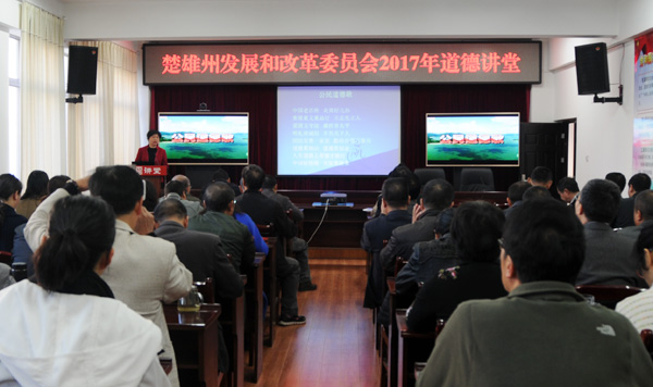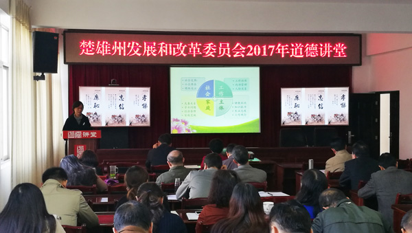 11月17日上午,州发改委2017年道德讲堂开讲:一是全体干部职工唱《公民道德歌》;二是诵经典诸葛亮《诫子书》;三是州医院心血管内科主治医师张丽梅讲授心血管疾病防治相关知识;四是楚雄州警校高级讲师、国家三级心理咨询师陈晓琳讲授心理压力的应对及策略。张医生主要从“三多、三高、三步骤”讲授了高血压预防的相关知识;陈老师主要从正确认识心理压力,积极应对压力的策略等方面进行了讲授。两位老师的讲授内容丰富、生动,具有较强的针对性和可操作性,其中,“压力的时间管理”不但有利于指导我们舒缓压力,而且对于科学统筹各项工作也具有积极的借鉴作用。