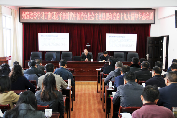 3月19日上午,州发改委组织开展贯彻新时代中国特色社会主义思想和党的十九大精神专题培训,州委党校高级讲师罗斌老师在培训班上全面系统地从新时代、新成就、新思想、新征程、新部署、新要求等方面,结合彝州的发展,对习近平新时代中国特色社会主义理论和党的十九大精神、以及《党章》进行了详细的解读,罗斌老师的解读图文并茂、内容详实、内涵丰富、分析透彻、入情入理,具有很强的理论性、针对性和指导性,使我们对习近平新时代中国特色社会主义思想和党的十九大精神有了更加深刻的理解,帮助我们理清了思路、明确了方向、坚定了信心。