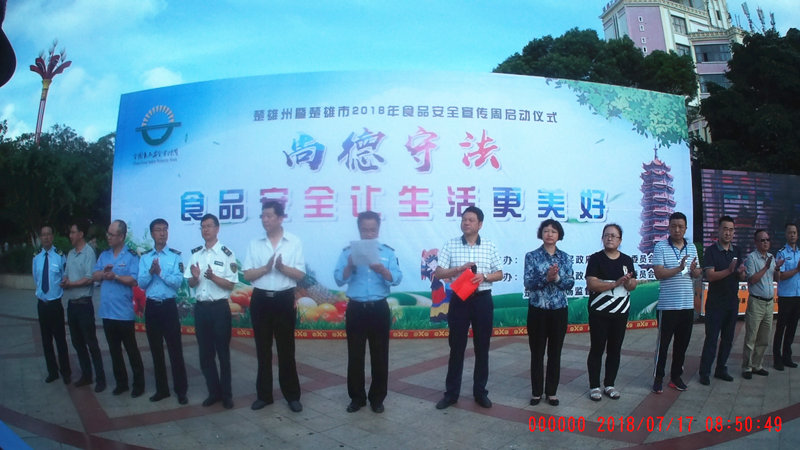 7月17日,由州食安委主办、楚雄市食安委和市场监督管理局承办,以“尚德守法?食品安全让生活更美好”为主题的全州2018年食品安全宣传周活动在桃源湖广场启动。楚雄州发改委李红梅副主任等15名干部职工参加了楚雄州2018年“食品安全宣传周”启动仪式及现场宣传活动。